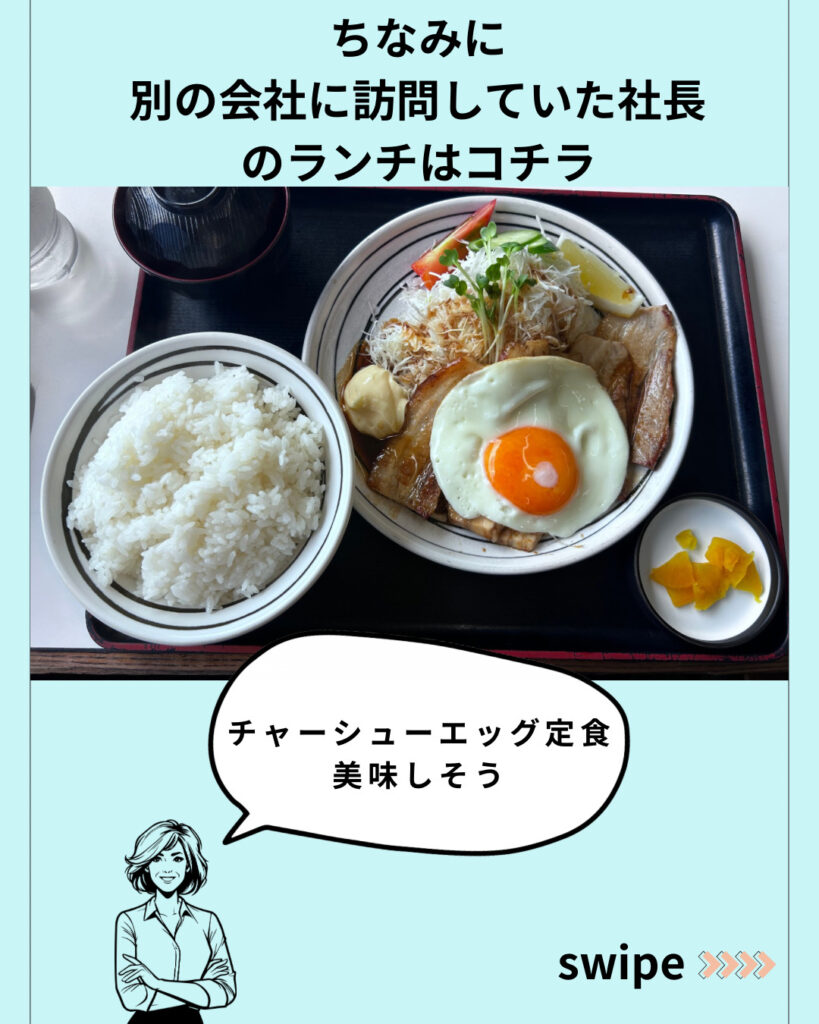この日は社長も別のお客さんの所へ訪問中。社長のランチはギルティです。