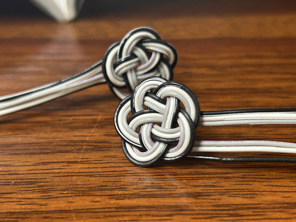 フラットケーブルの黒、白、グレーを割いて梅結びにしました。こちらもピアスになりました。