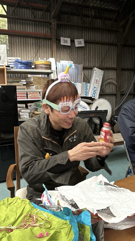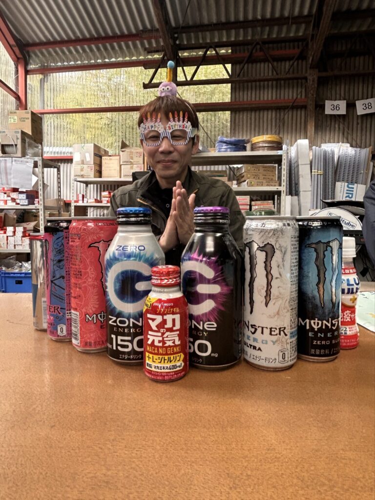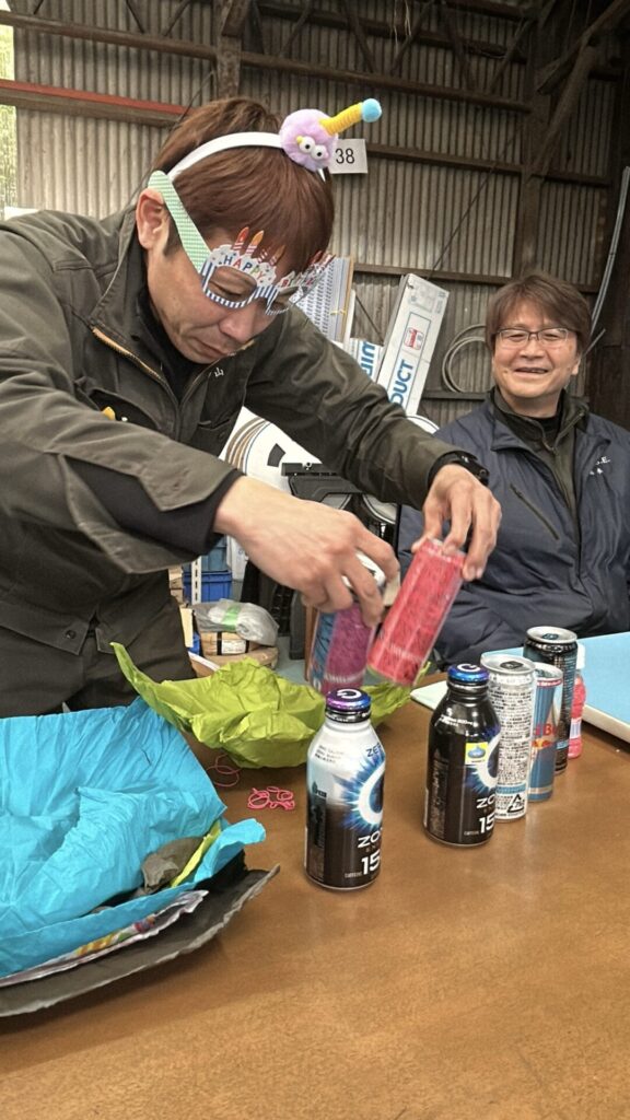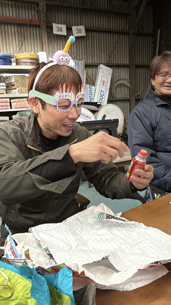 工場長 お誕生日会 2026.03.04 ブログ 15時の休憩時間に、工場長のお誕生日会をしました。 ハピバメガネをかけて登場していただき 大先生から、なんだかわからないカチューシャの贈呈後、社長の物欲リボルバーで盛大にお祝い。 散らかった紙を集めます。 みんなからのプレゼント。明けても暮れてもでてくるのはエナジードリンク。 先日まで体調不良だったので、元気を出してもらおうと、社長からはマカドリンクのプレゼント。 「マ、マカ?」 ご満悦の工場長でした。 おめでとうございました。 総社市 ランチ 前の記事
