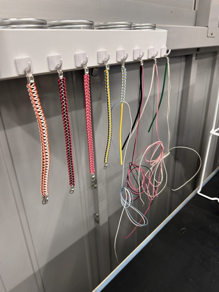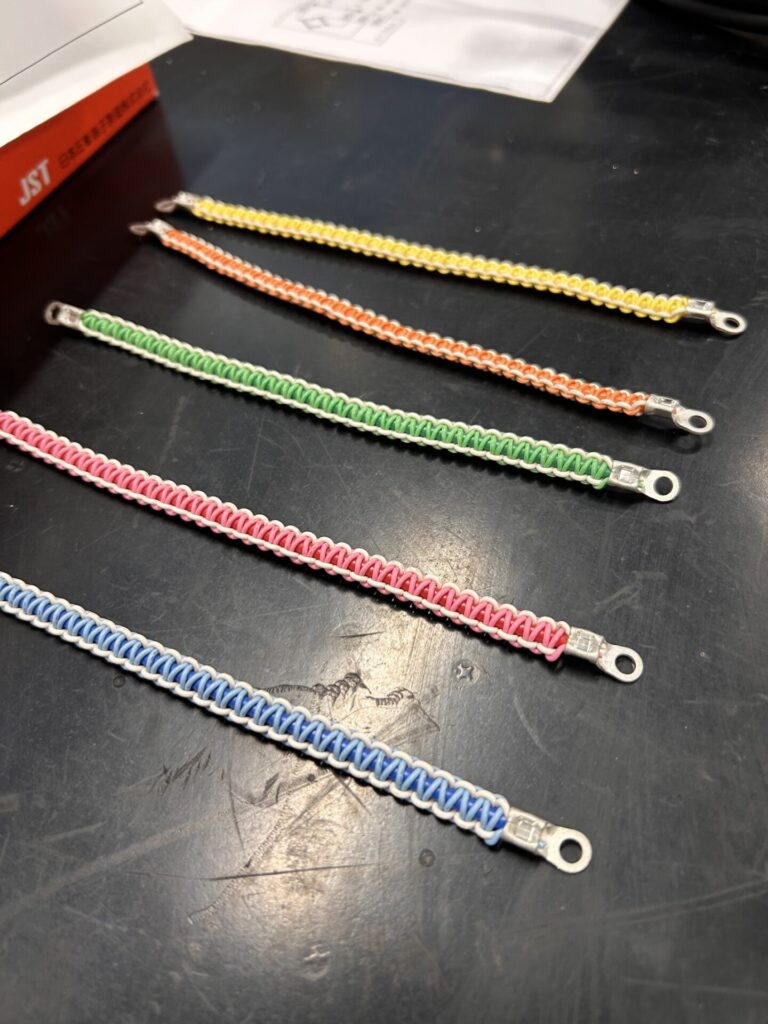 その芯のまわりを編んでいく、外側のカラフルな部分に、一部新品の電線も使うようになりました。